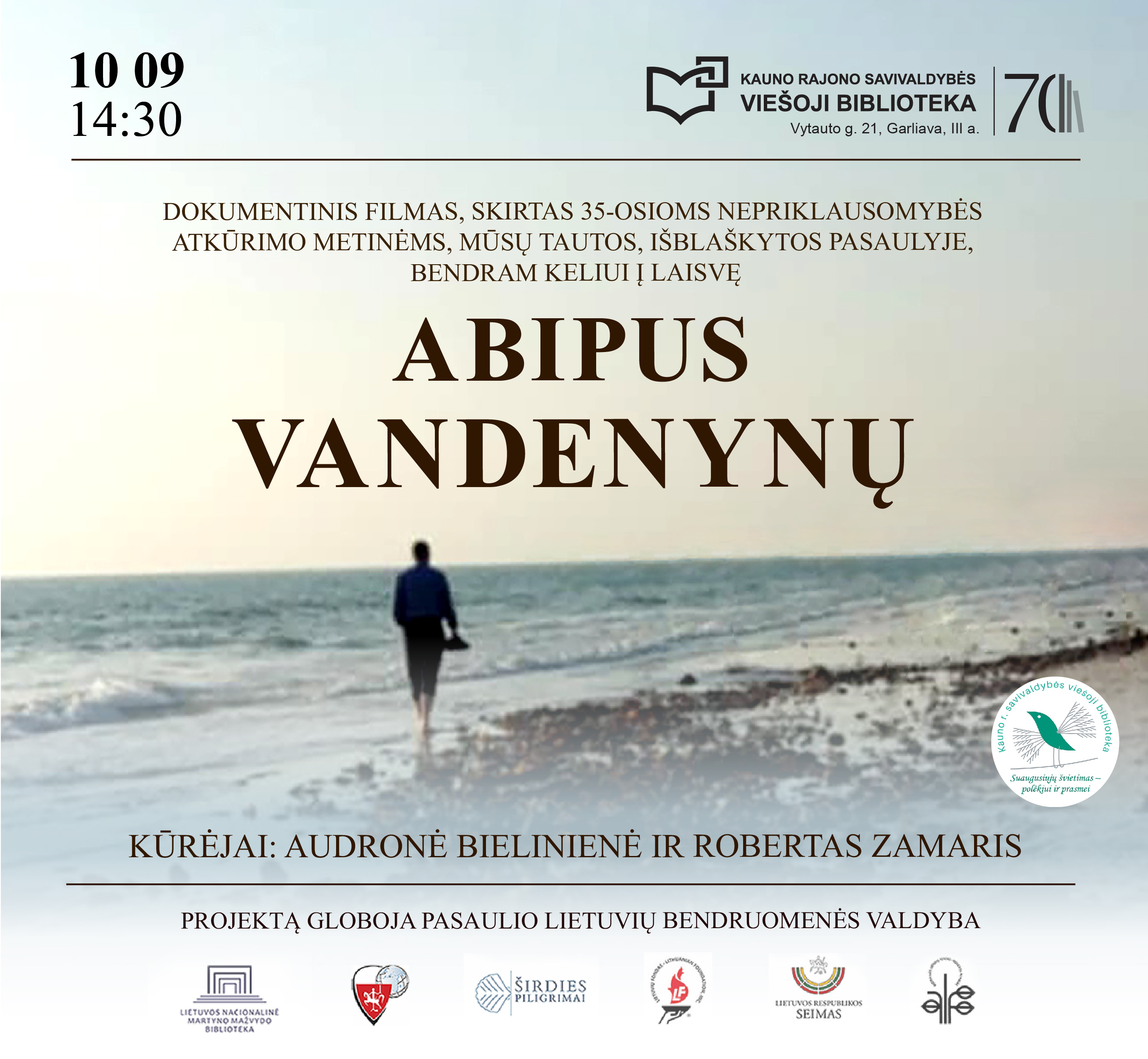 Spalio 9 d. 14.30 val. Kauno rajono savivaldybės viešojoje bibliotekoje, Garliavoje, žiūrėsime dokumentinį filmą „Abipus vandenynų“, pasakojantį apie mūsų tautos, išblaškytos pasaulyje, bendrą kelią į Laisvę. Šis filmas, kurtas Australijoje, JAV ir Lietuvoje, yra skirtas Kovo 11-osios 35-osioms metinėms.