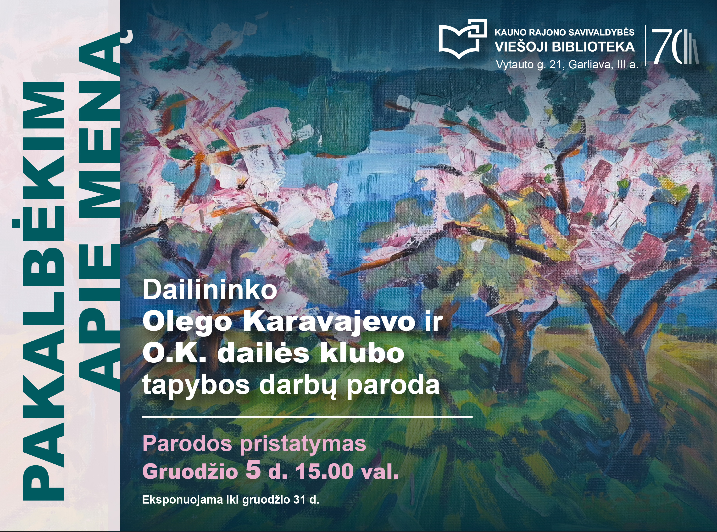 Šiemet O. K. dailės klubas švenčia 25-metį! Jubiliejinėje parodoje pristatoma dailininko, tapytojo Olego Karavajevo (1946–2021) kūryba ir jo įkurto O. K. dailės klubo narių darbai. „Esu laimingas: pasaulį matau be galo gražų ir spalvingą..." – kadaise sakė Olegas Karavajevas.