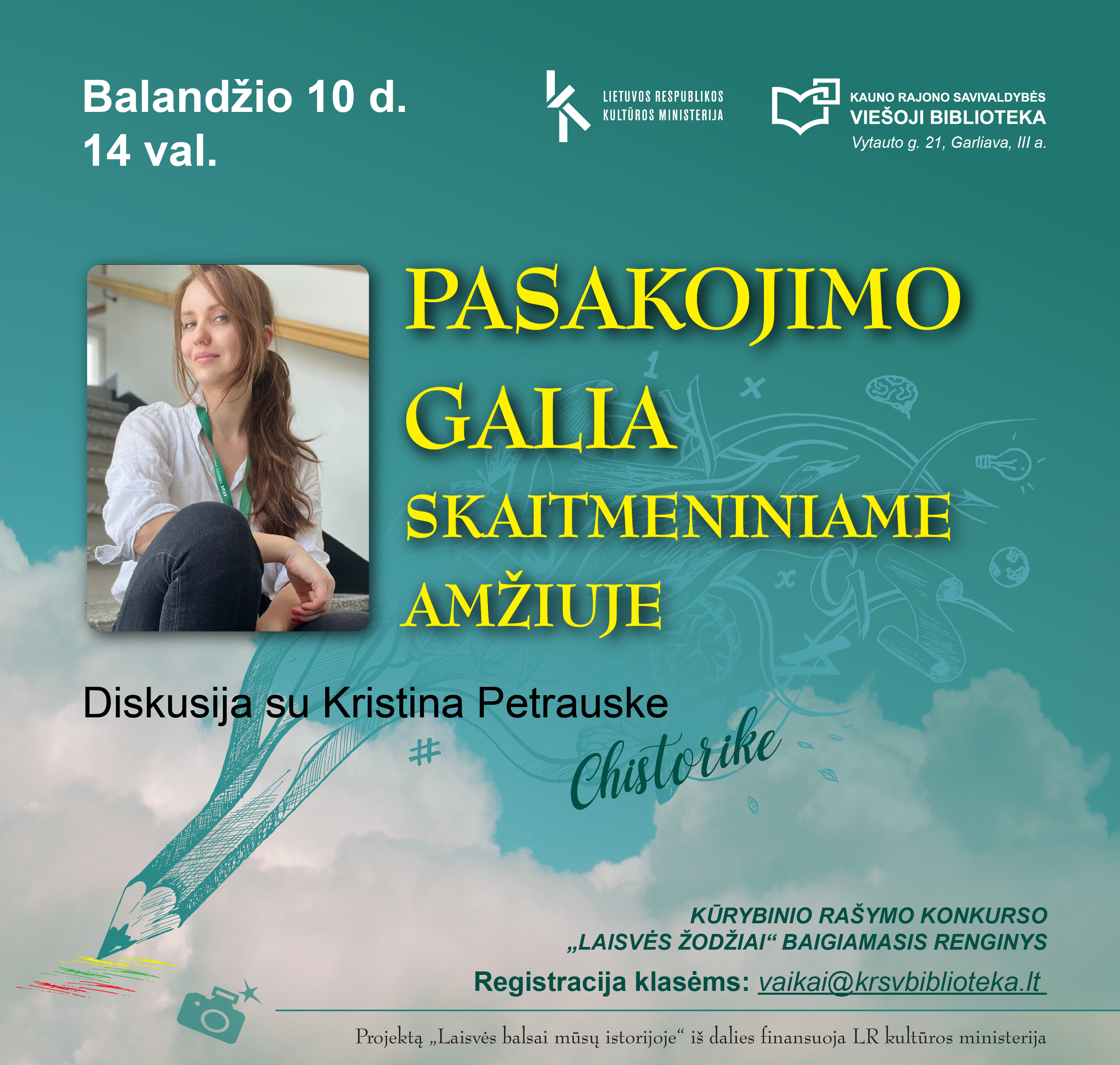 Vyresnių klasių moksleivius ir suaugusiuosius kviečiame į susitikimą su istorike, Vytauto Didžiojo karo muziejaus direktoriaus pavaduotoja Kristina Petrauske, socialiniuose tinkluose atpažįstama Chistorikės pseudonimu. Ji bene geriausiai žino, kaip pasakojimas tampa galinga jėga: tiek muziejuje, tiek „TikTok’e“, tiek baltame lape. Šįkart bibliotekoje nebus paskaitos. Bus pokalbis, klausimai, pasakojimai – ir jos, ir tavo. Patyrinėsime, kodėl vienas gyvas ir tikras žmogaus pasakojimas yra paveikesnis ir pasiekia plačiau bei giliau nei šimto faktų sąrašas. Paanalizuosime, kaip keičiasi šiuolaikinis pasakojimas, patekęs į skaitmeninę socialinių tinklų terpę. Paieškosime būdų, kaip kiekvienam pasakotojui ištobulinti asmeninį balsą, nesvarbu, kokią pasakojimo formą naudojate: tekstą, trumpą vaizdo siužetą ar kt.