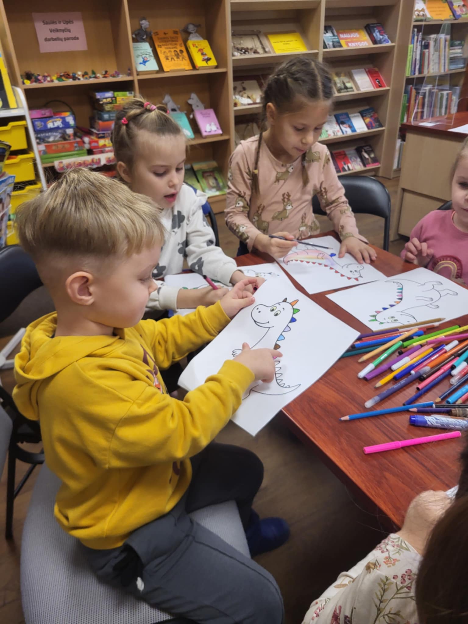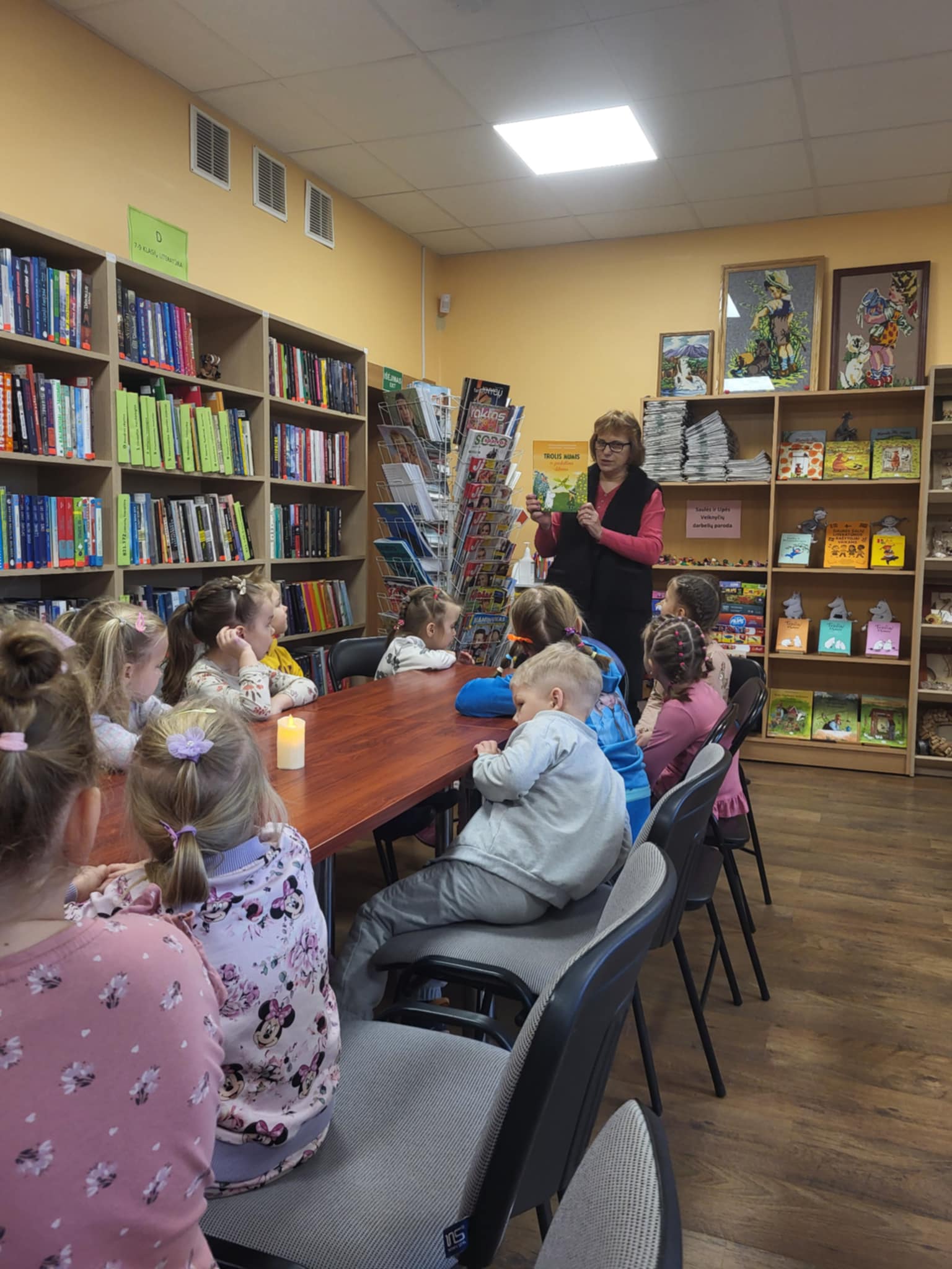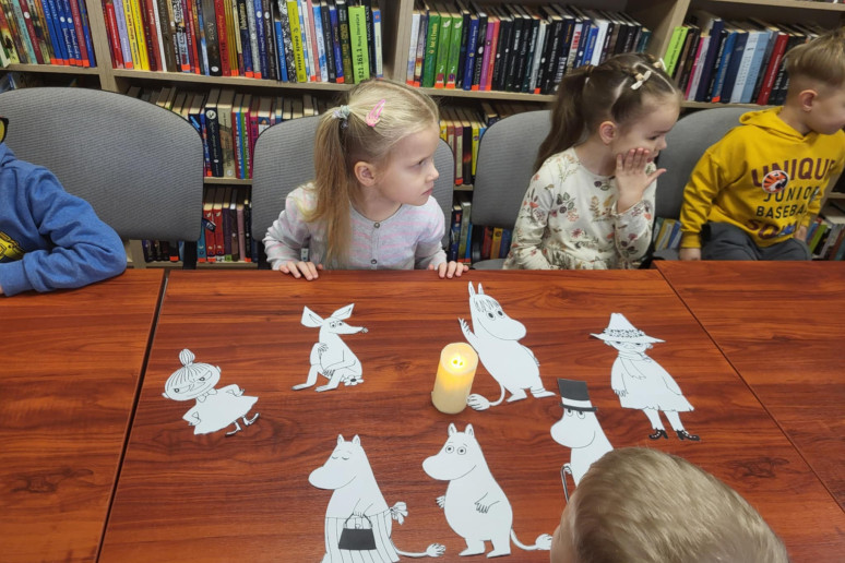 Lapkričio 14 d., minint Šiaurės šalių literatūros savaitę, popietė bibliotekoje buvo jauki ir kupina ramios kūrybinės nuotaikos. Kartu su priešmokyklinio ugdymo grupės vaikais, virpant žvakės liepsnelei, skaitėme Tovės Jansson istorijos motyvais sukurtą knygą „Trolis Mumis ir paskutinis slibinas“. Visus įtraukė pasakojimo šiluma, nuotykiai ir Muminuko smalsumas. Vaikai klausėsi susidomėję, sekdami kiekvieną pasakojimo vingį. Baigus skaityti pasakojimą, mažieji ėmėsi kūrybinės užduoties – spalvino slibino piešinį. Kiekvieno vaiko slibinas pamažu įgavo savitą išvaizdą: vieni rinkosi ryškias spalvas, kiti – švelnius atspalvius, o kai kurie pridėjo ir savo sukurtų detalių. Bibliotekoje sklandė kūrybinis šurmulys, tylus bendravimas ir daug fantazijos.