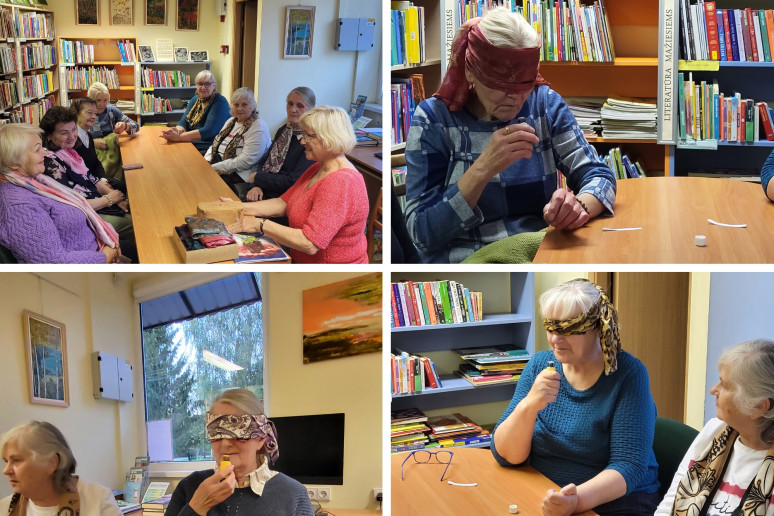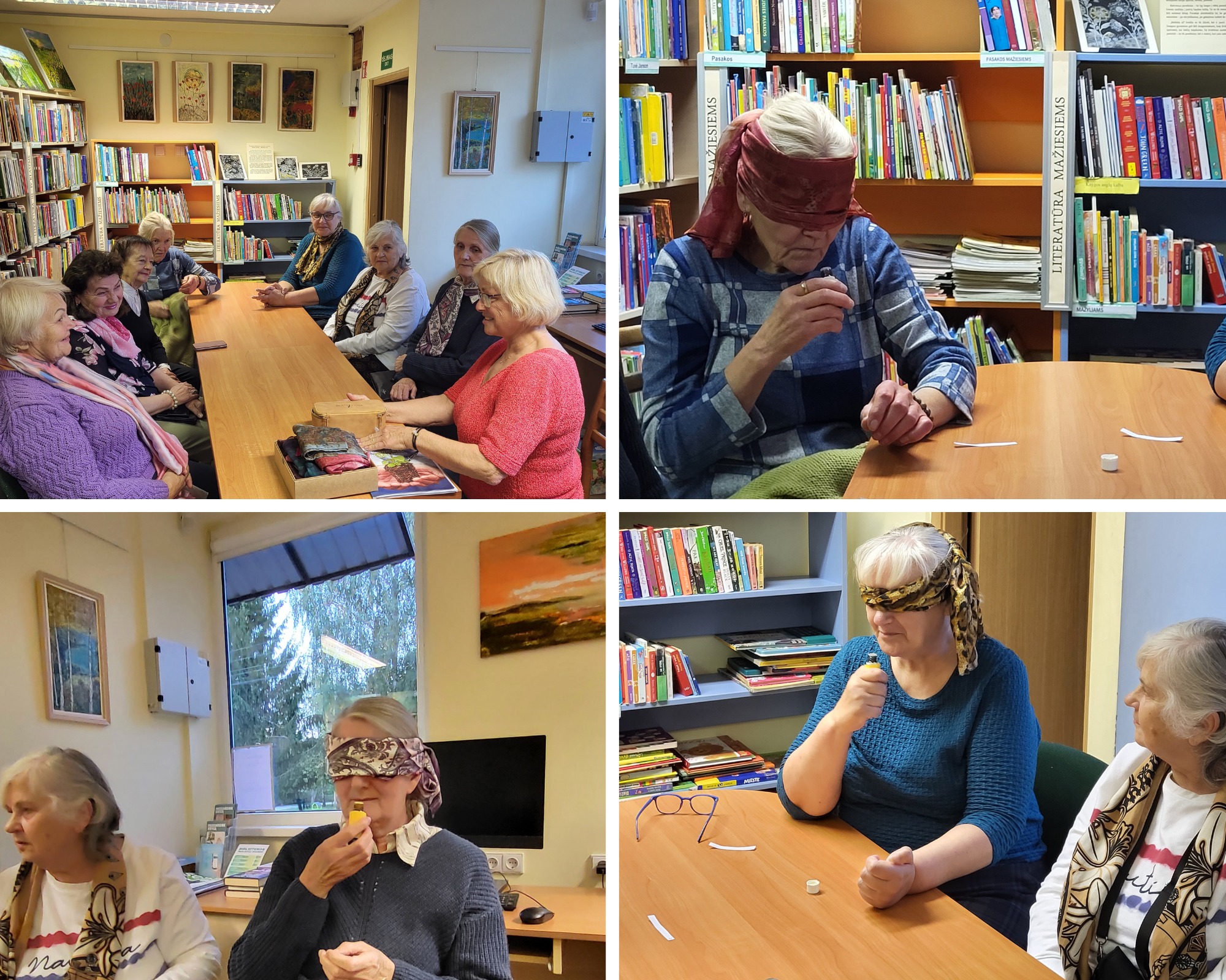 Spalio 8 d. bibliotekoje kvepėjo eteriniais aliejais – vyresnio amžiaus moterys mokėsi pažinti kvapus, juos atspėti užrištomis akimis, juokėsi ir dalijosi bendryste.