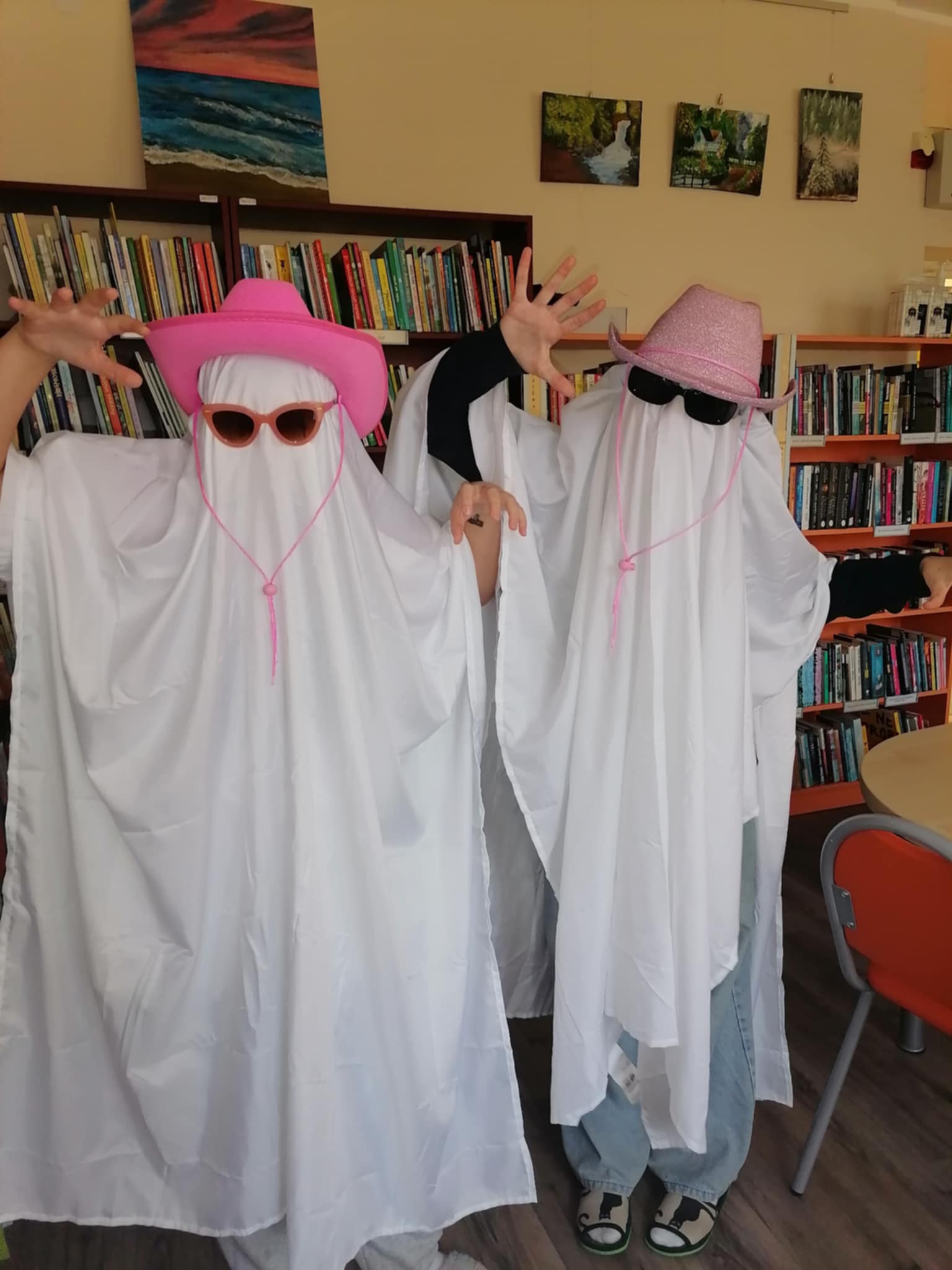 Tarp lentynų šmėkščiojo paslaptingi vaiduokliai, knygos tyliai šnabždėjo! Pasirodo, tie draugiški vaiduokliai atėjo ne gąsdinti, o pakviesti visus į Helovino puotą! Buvo daug juoko, žaidimų, kūrybos ir geros nuotaikos! Didelis ačiū Voškonių dienos centras „Sparnai“ už linksmą, šiltą ir magišką bendrystę – kartu net tamsiausia diena tampa šviesi!