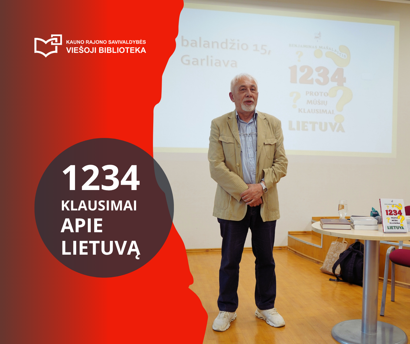 Balandžio 15 dieną Kauno rajono savivaldybės viešosios bibliotekos Konferencijų salėje gyvai ir įtraukiai vyko knygos „1234 proto mūšių klausimai. Lietuva“ pristatymas. Susirinkusiuosius pasveikino autorius Benjaminas Mašalaitis – istorikas, pedagogas, vertėjas ir proto mūšių meistras iš Marijampolės, puikiai žinantis, kaip priversti smegenis dirbti su malonumu.