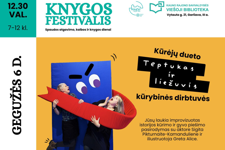 12.30–13.30 val. Kūrėjų dueto „Teptukas ir liežuvis“ kūrybinės dirbtuvės: aktorė Sigita Pikturnaitė-Kamandulienė ir iliustruotoja Greta Alice