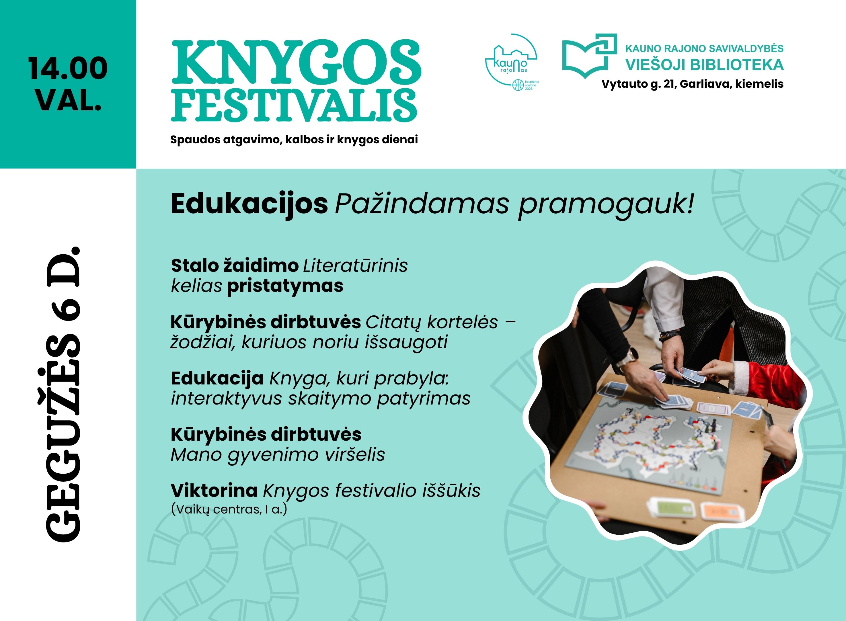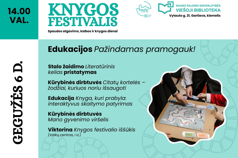 „Knygos festivalis – tradicijos tęsiasi“ – tai Kauno rajono savivaldybės viešosios bibliotekos pasiūlymas knygą paversti išskirtiniu patyrimu, o kultūrą – gyvu, bendruomenę vienijančiu procesu. Kviečiame Jus tapti šios istorijos dalimi. Ateikite kurti, klausytis, patirti ir švęsti bendruomeniškumą per lietuvišką žodį. Visos veiklos nemokamos. Projektą remia Kauno rajono savivaldybė („Šiuolaikinės seniūnijos“).