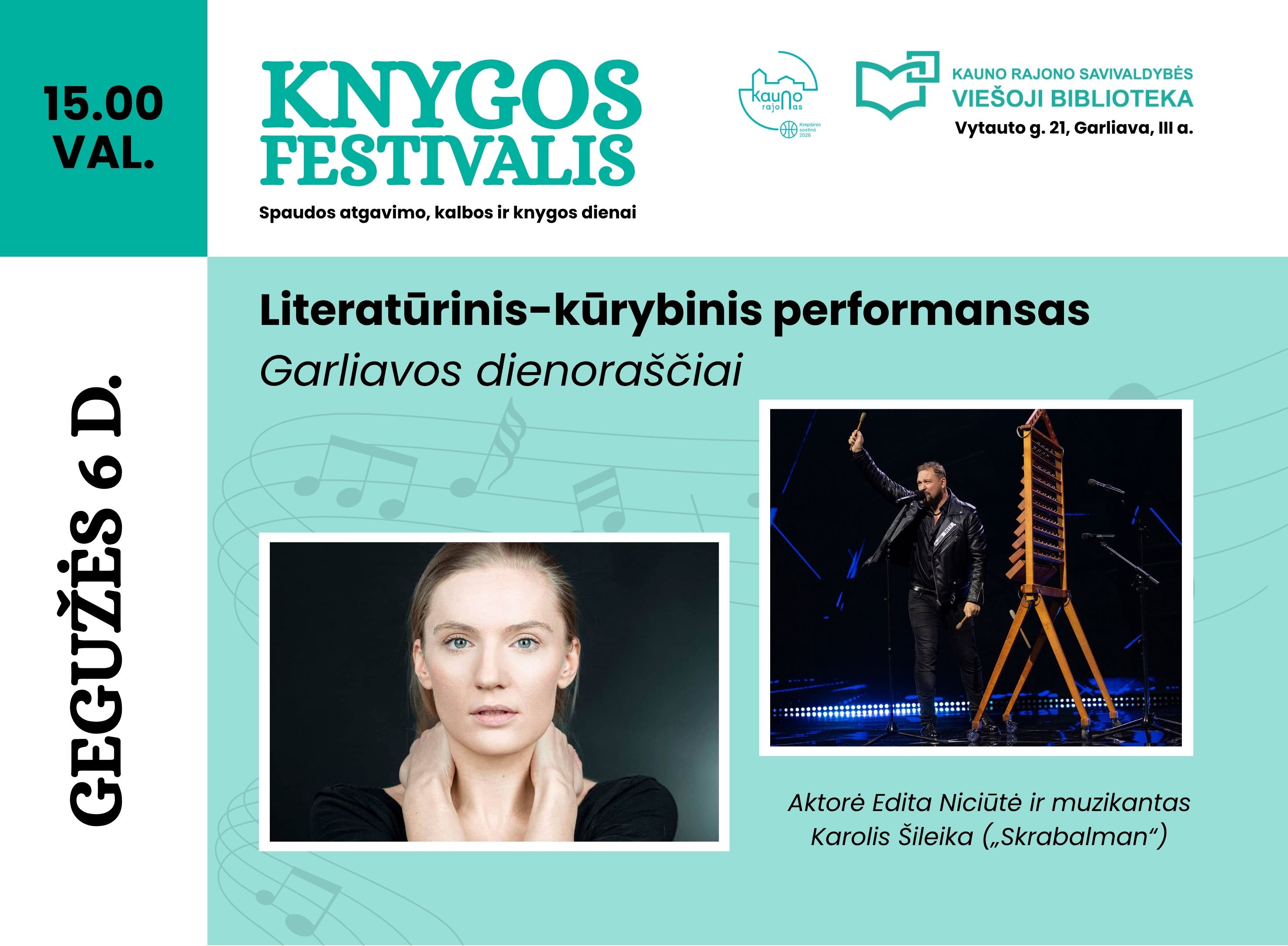 15.00–17.00 val. Literatūrinis-kūrybinis performansas „Garliavos dienoraščiai“ su aktore Edita Niciūte ir skrabalų virtuozu Karoliu Šileika (Skrabalman)