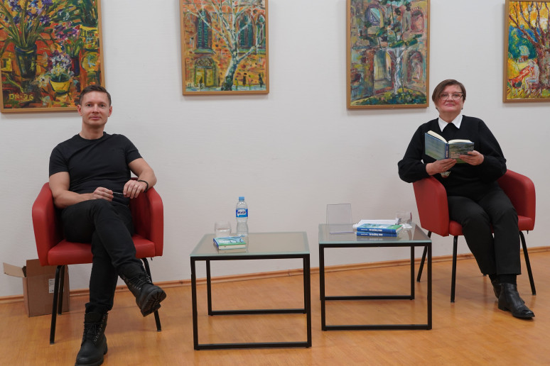 Spalvingų ir labai savitų tapybos darbų, puošiančių salę, kurioje vyko renginys, autorius – šviesaus atminimo dailininkas Olegas Karavajevas, buvęs Garliavos Jonučių gimnazijos technologijų mokytojas. Vaizdinės ir žodinės kūrybos sampynos, įtraukiantis pasakojimas, nuoširdumas, emocijų spalvingumas ir charizma – štai tokį nepaprastą vakarą praleidome bibliotekoje.