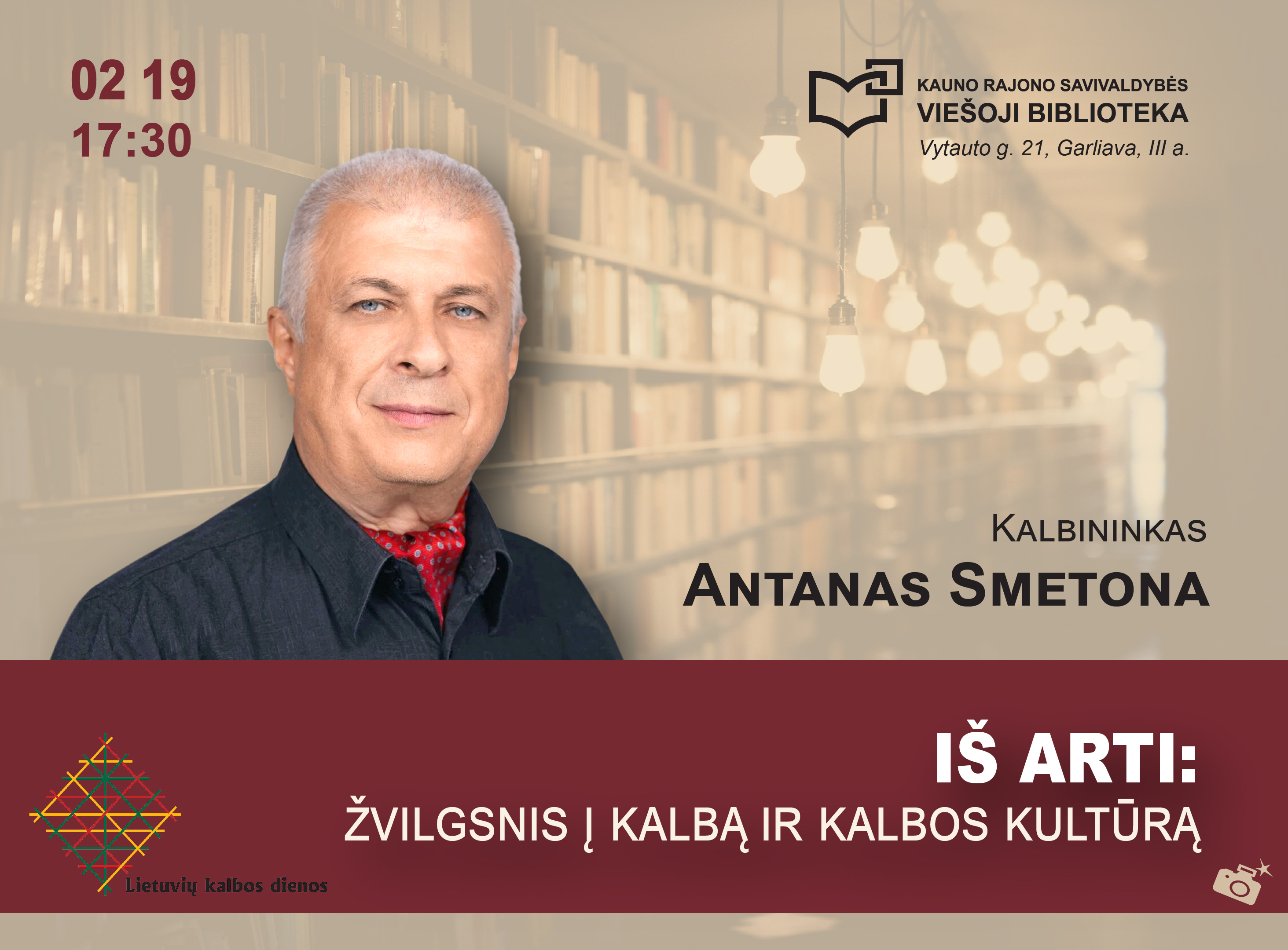 Profesorius A. Smetona – Vilniaus universiteto Filologijos fakulteto dekanas; docentas; pirmininkavęs Lietuvių kalbos draugijai, lingvistinės ekspertizės Lietuvos teismams specialistas, buvęs LRT laidos „Krašto garbė“ vedėjas, vadovėlių, žodynų ir gausybės straipsnių autorius – bibliotekoje pasidalys mintimis, skatinančiomis įdėmiau patyrinėti, kaip kalbame kasdien. Maloniai kviečiame.