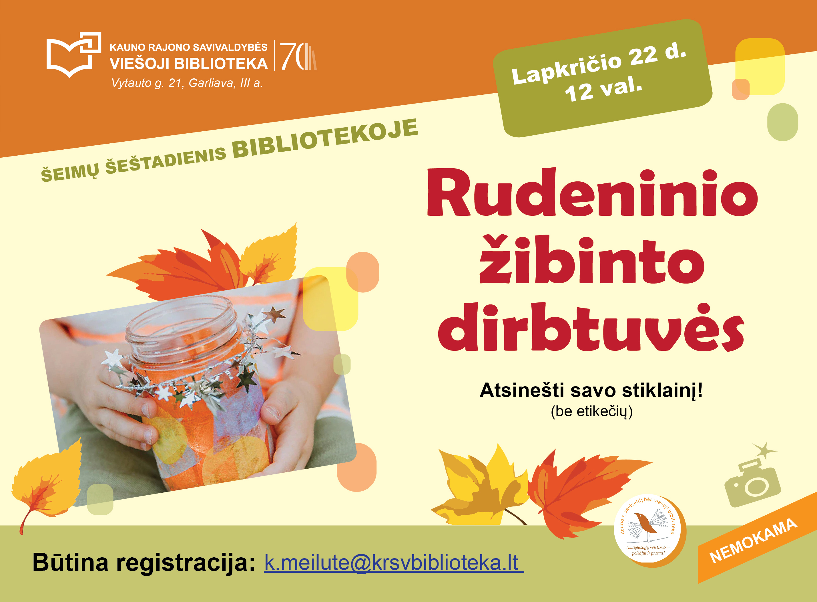 Lapkričio 22 d., šeštadienį, 12 val. kviečiame Kauno rajono šeimas į rudeninio žibinto dirbtuves. Kartu kursime jaukiai spindinčius žibintus, kurie apšvies ilgus rudens vakarus šilta šviesa.