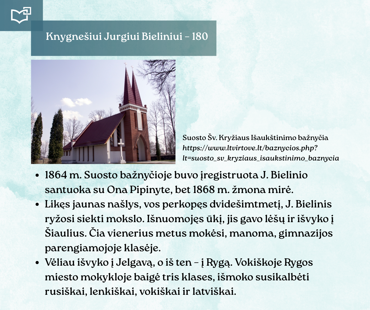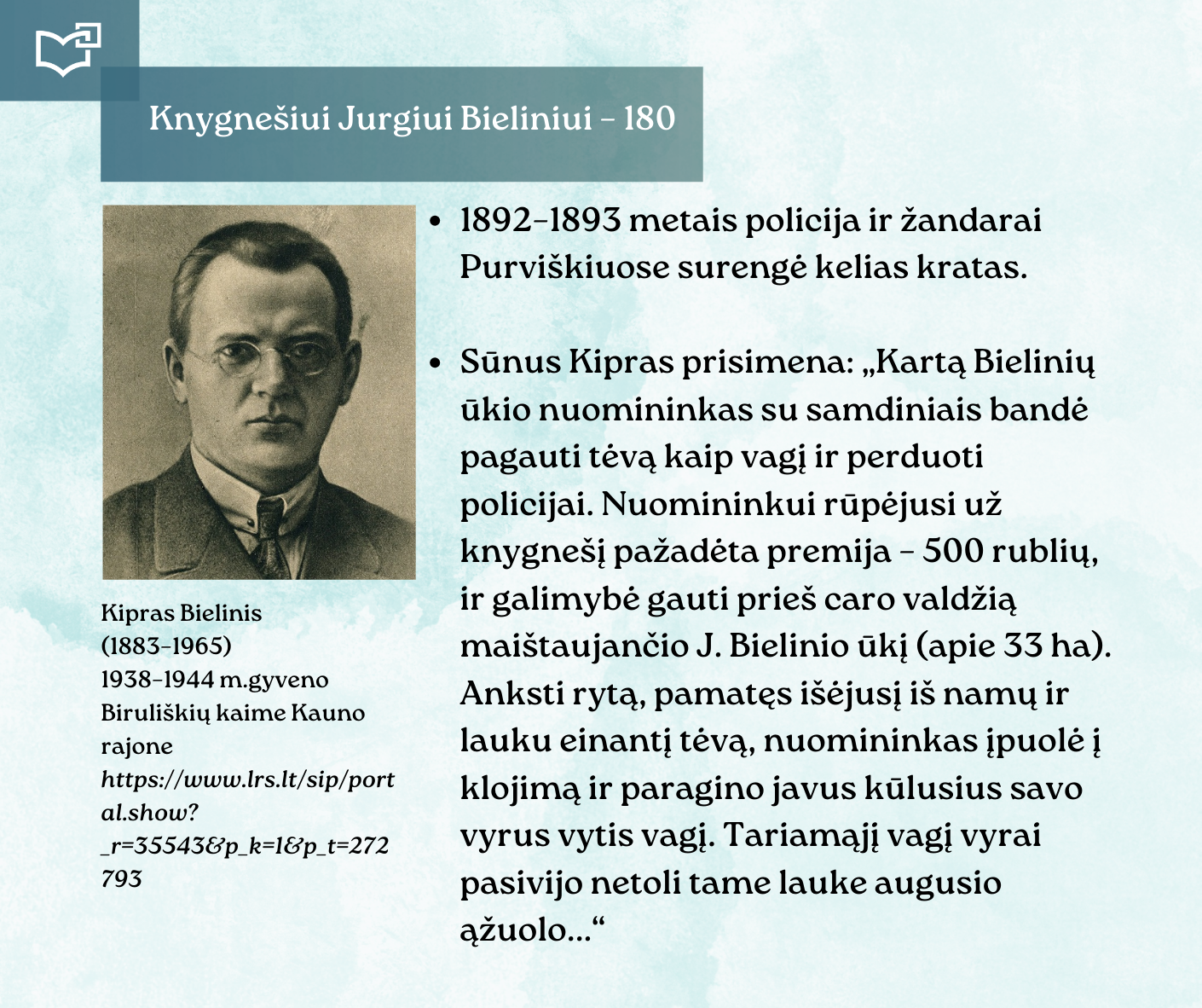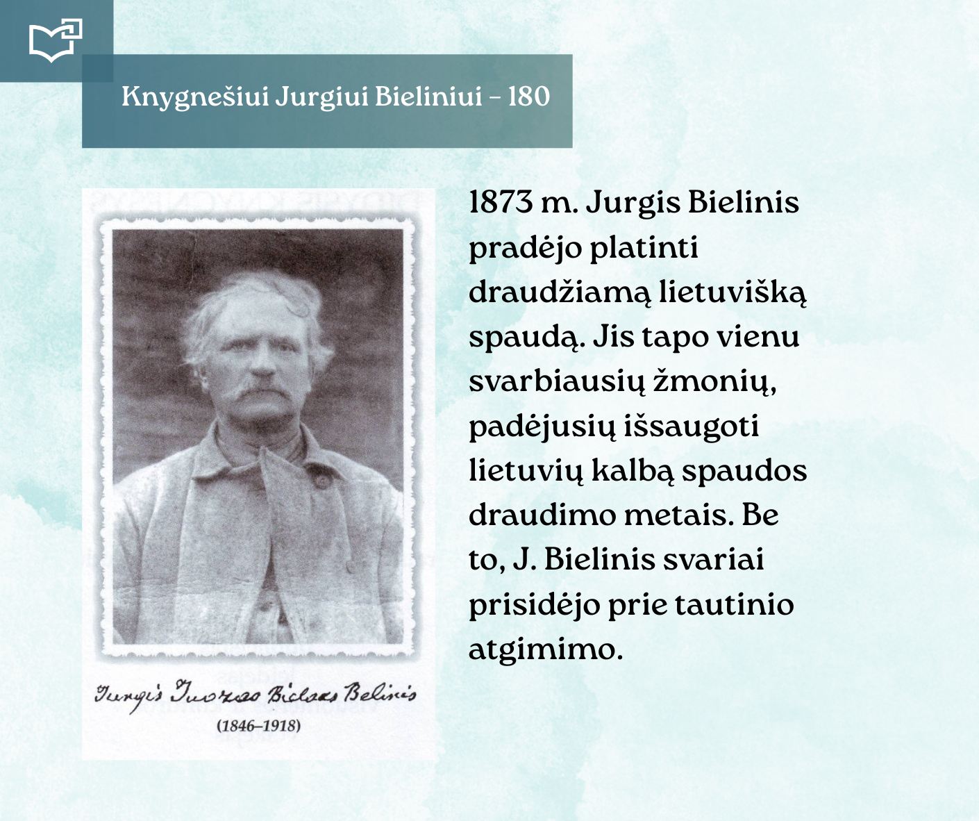 Kovo 16-osios – Knygnešio dienos – ir 180-ųjų Jurgio Bielinio gimimo metinių proga kviečiame Jus susipažinti su nauja virtualia paroda, skirta vienam ryškiausių lietuviško žodžio gynėjų. Kauno rajono savivaldybės viešosios bibliotekos vyr. bibliotekininkė Virginija Tamašauskienė parengė išsamią ekspoziciją, atskleidžiančią J. Bielinio nuopelnus knygnešystei, jo indėlį į tautinio sąmoningumo žadinimą ir kovą už lietuvišką žodį spaudos draudimo metais. Jurgis Bielinis – tai ne tik knygnešys, bet ir švietėjas, organizatorius, drąsuolis, kuriam lietuviškų knygų platinimas tapo gyvenimo misija. Jo veikla įkvėpė šimtus ir padėjo išsaugoti lietuvybę tamsiausiomis tautos istorijos valandomis.