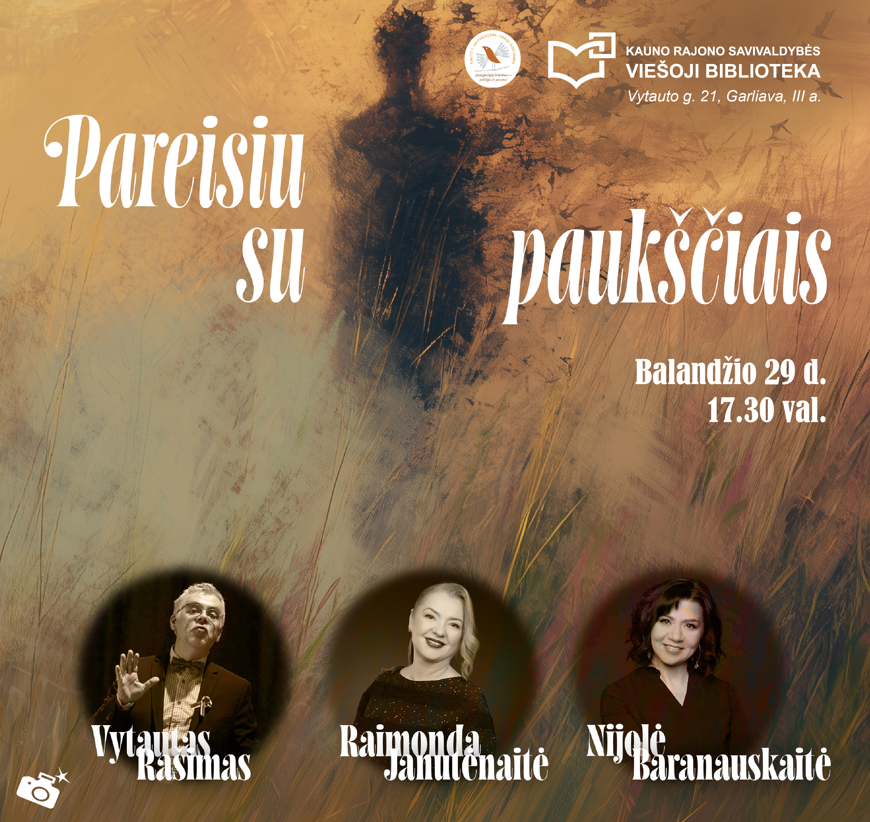 Maloniai kviečiame pasiklausyti atgimstančių vieno žymiausių lietuvių poeto žodžių! Marcelijaus Martinaičio 90-osioms gimimo metinėms skirto vakaro programą „Pareisiu su paukščiais“ atliks aktorius, gitaristas Vytautas Rašimas, mecosopranas Raimonda Janutėnaitė, pianistė Nijolė Baranauskaitė. Išgirsite gerai žinomų dainų pagal poeto tekstus; aktoriaus skaitomi eilėraščiai suteiks žodžiams naujos gyvybės pulsavimą. Bus dalijamasi prisiminimais apie poetą – kaip dėstytoją, mokslininką, draugą. Marcelijus Martinaitis (1936–2013) – vienas iškiliausių lietuvių poezijos balsų. Jo eilėraščiai – tai ne tik grožinė literatūra, bet ir tautos savivokos kronika, parašyta tuo metu, kai tiesiai kalbėti buvo pavojinga.
