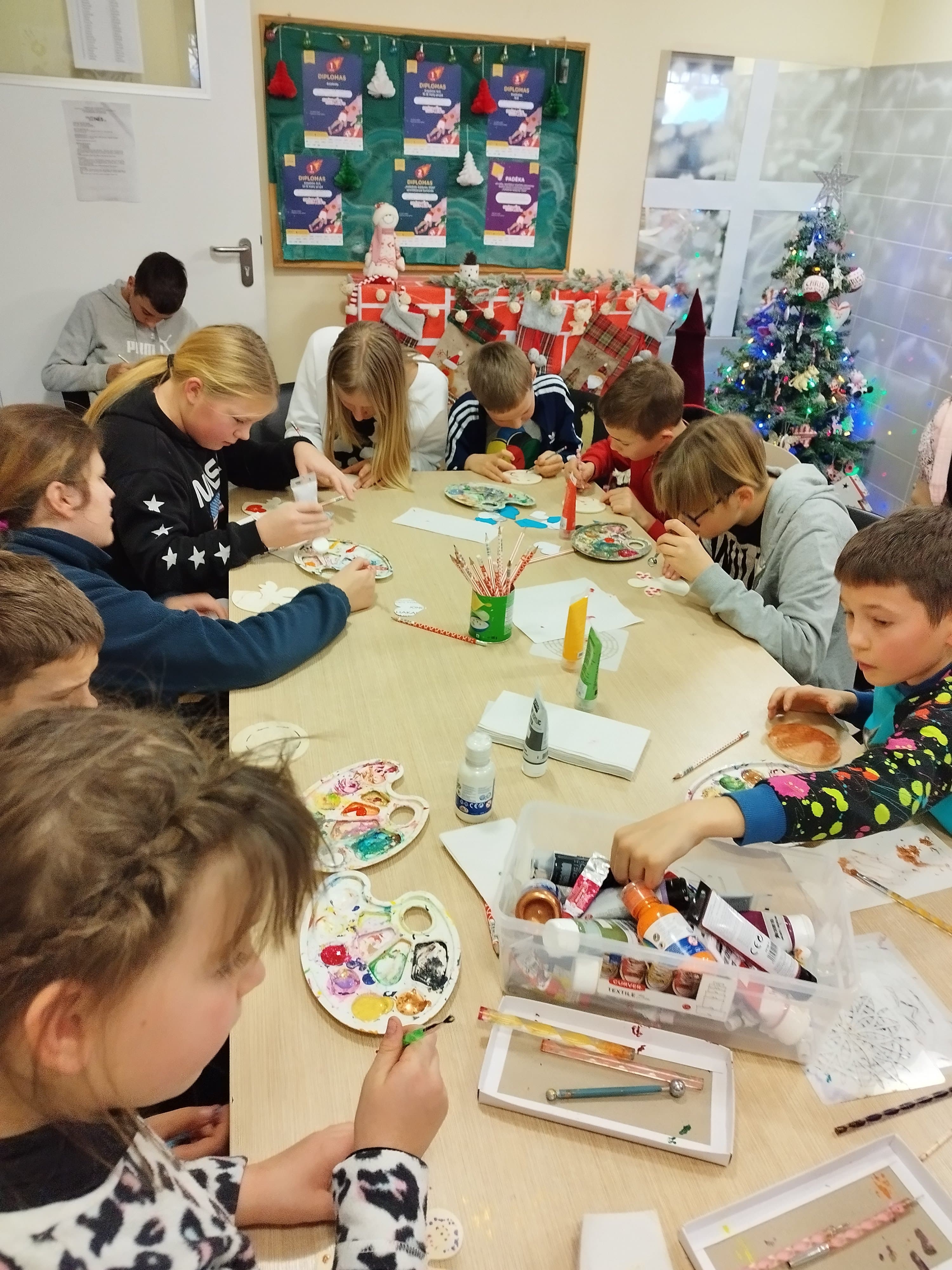 Pas mažuosius draugus į Vilkiją vyko Kauno rajono savivaldybės viešosios bibliotekos edukatorė Kristina Meilutė, jai talkino Vilkijos miesto bibliotekos vyr. bibliotekininkė Jolanta Bačėnienė. Artėjančių švenčių proga Karmėlavos, Neveronių ir Vilkijos bibliotekos dovanojo vaiko ir šeimos gerovės centrui knygelių ir skanumynų, vaisių. Edukatorė Kristina Meilutė vedė meninio taškavimo edukaciją: akriliniais dažais vaikai taškavo kalėdinio dekoro elementus – angeliukus ir padėkliukus. Visi smagiai leido laiką, atsidavę kūrybai.