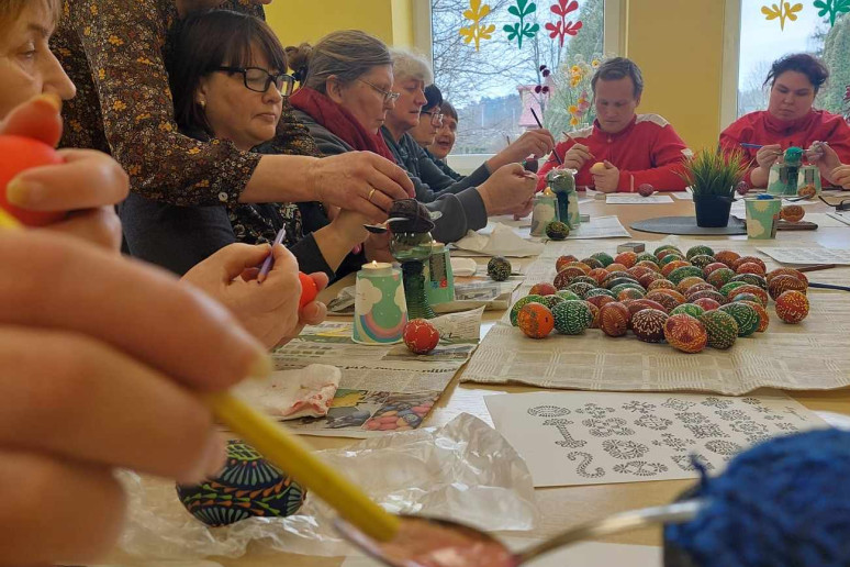 Bendradarbiaudami su Zapyškio bendruomeninių paslaugų centru, dalyvavome edukacijoje „Šv. Velykų džiaugsmas“ Neįgaliųjų socialinės reabilitacijos bendruomenėje ir vedini bendruomenės narės Vidos kūrybiškai išbandėme ne vieną kiaušinių marginimo būdą, drąsiai žaidėme spalvomis, dalijomės marginimo raštais.