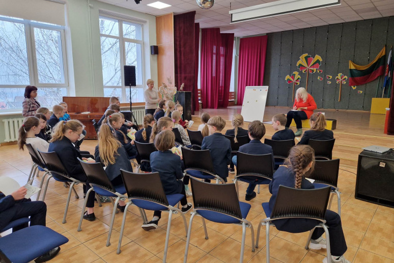Gimnazijoje pabendravome nuoširdžiai, jaukiai ir šiltai. Susitikime autorė skaitė savo kūrinių ištraukas, piešė knygos veikėjus, atsakė į smalsuolių klausimus. Kiekvienas dalyvis dovanų gavo spalvinimo knygelę su autorės autografu, o klasės – knygų komplektus. R. Savickytė labai šiltai bendravo su mokiniais, vaikai atsisveikino kupini gerų emocijų.