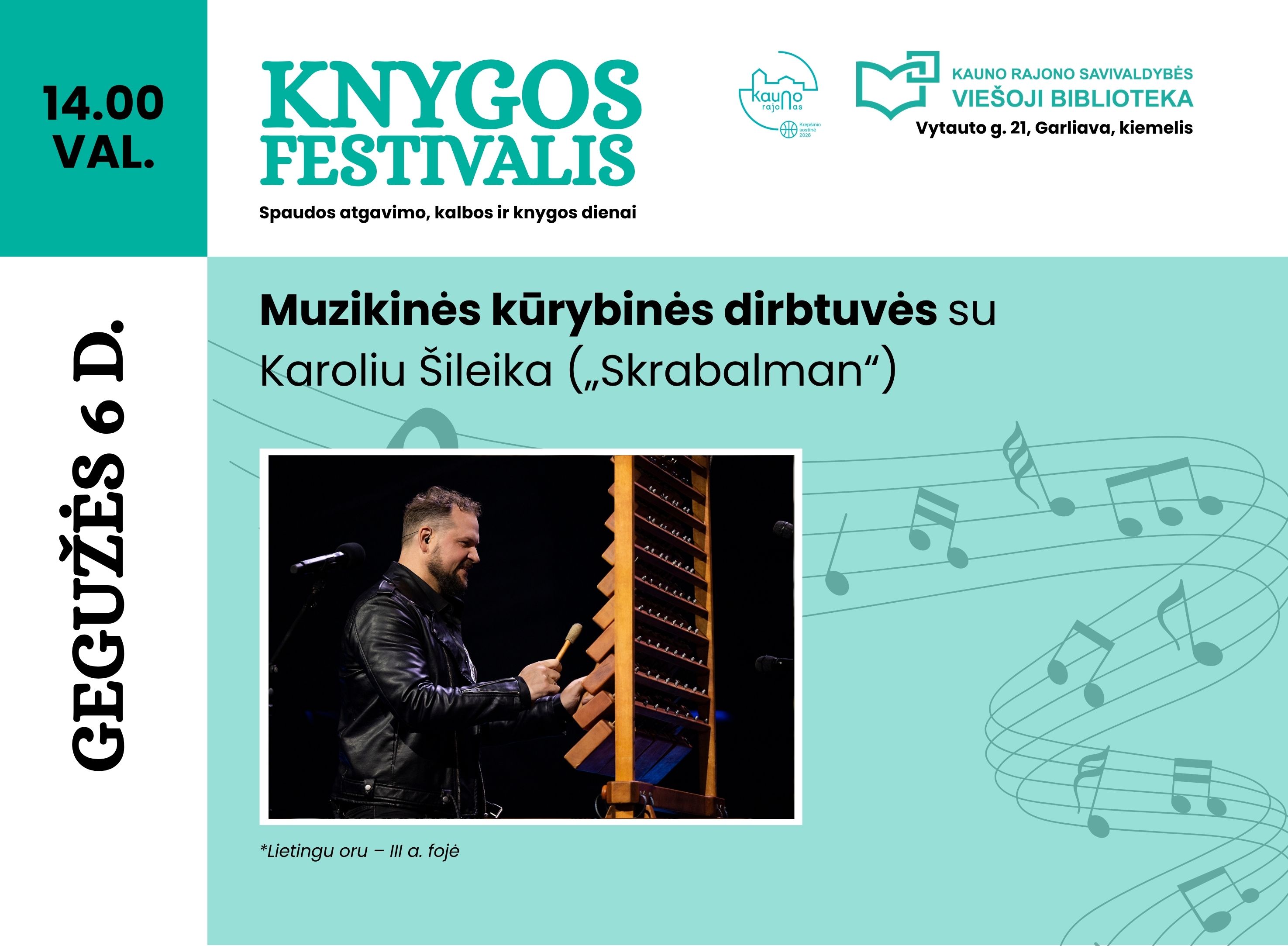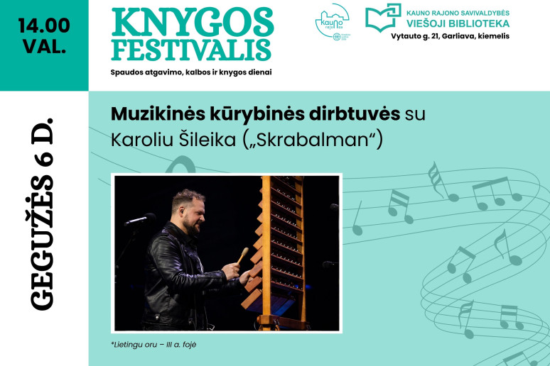 14.00–15.00 val. Muzikinės kūrybinės dirbtuvės su skrabalų virtuozu Karoliu Šileika (Skrabalman)