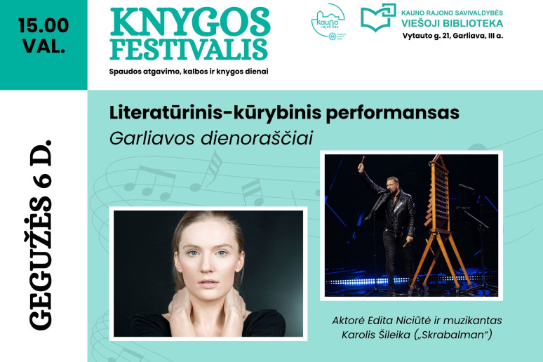 15.00–17.00 val. Literatūrinis-kūrybinis performansas „Garliavos dienoraščiai“ su aktore Edita Niciūte ir skrabalų virtuozu Karoliu Šileika (Skrabalman)