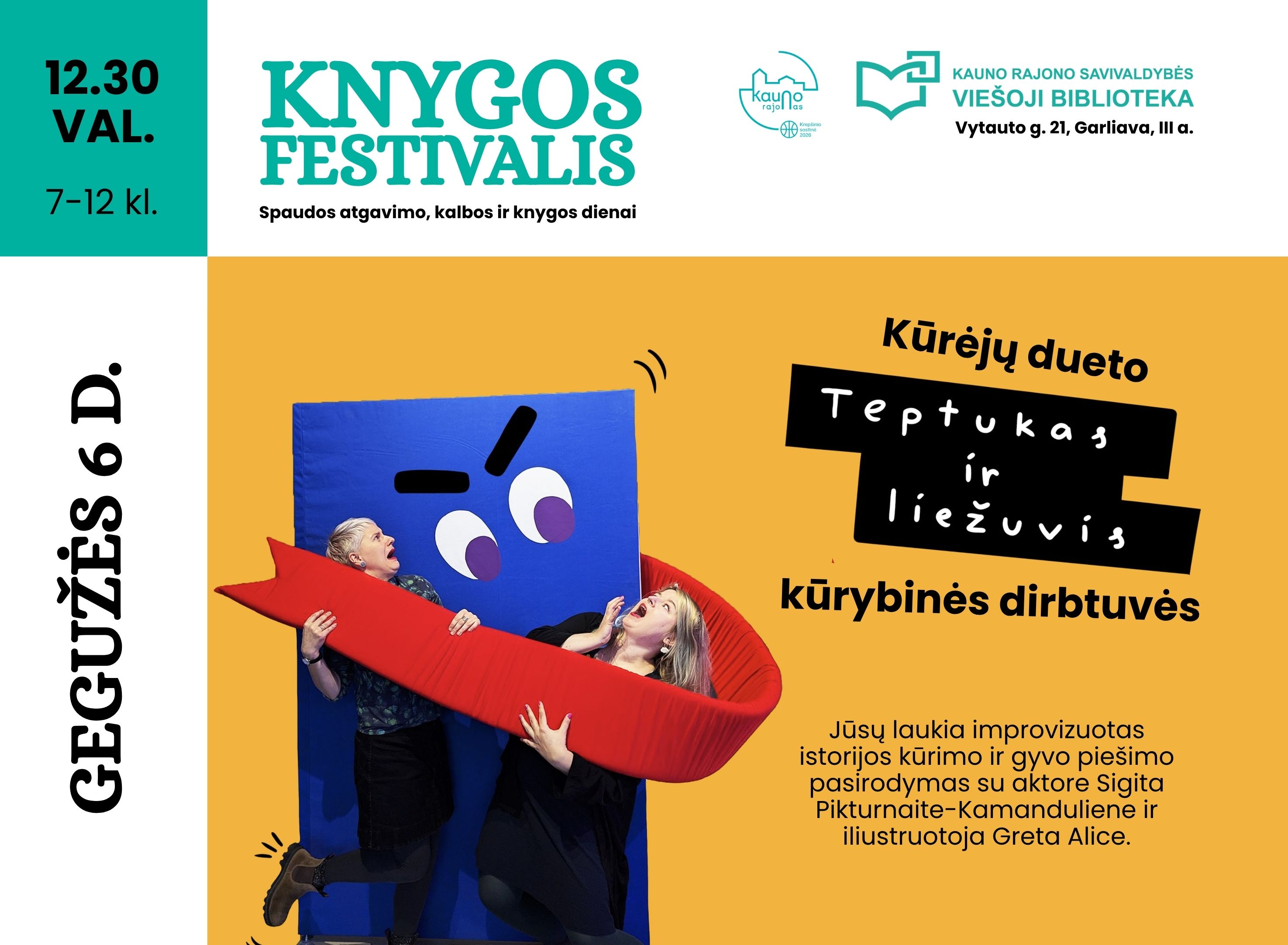 Vyresniems moksleiviams skirtose kūrėjų dueto „Teptukas ir liežuvis“ edukacinėse dirbtuvėse (12.30 val.) Sigita Pikturnaitė-Kamandulienė (teatro ir kino aktorė, režisierė, teatro improvizacijos entuziastė, teatro pedagogė, kūrybinių ir edukacinių stovyklų organizatorė bei vadovė, kūrybinių skaitymų kūrėja) ir Greta Alice (dailininkė ir iliustruotoja, komiksų kūrėja, dirbtuvių vedėja, vaikų literatūros festivalio organizatorė) atskleis improvizuotos istorijos ir iliustracijos gimimą. Edukacijos dalyviai pamatys, kaip jų kuriama istorija iš karto virsta gyvai piešiama iliustracija.