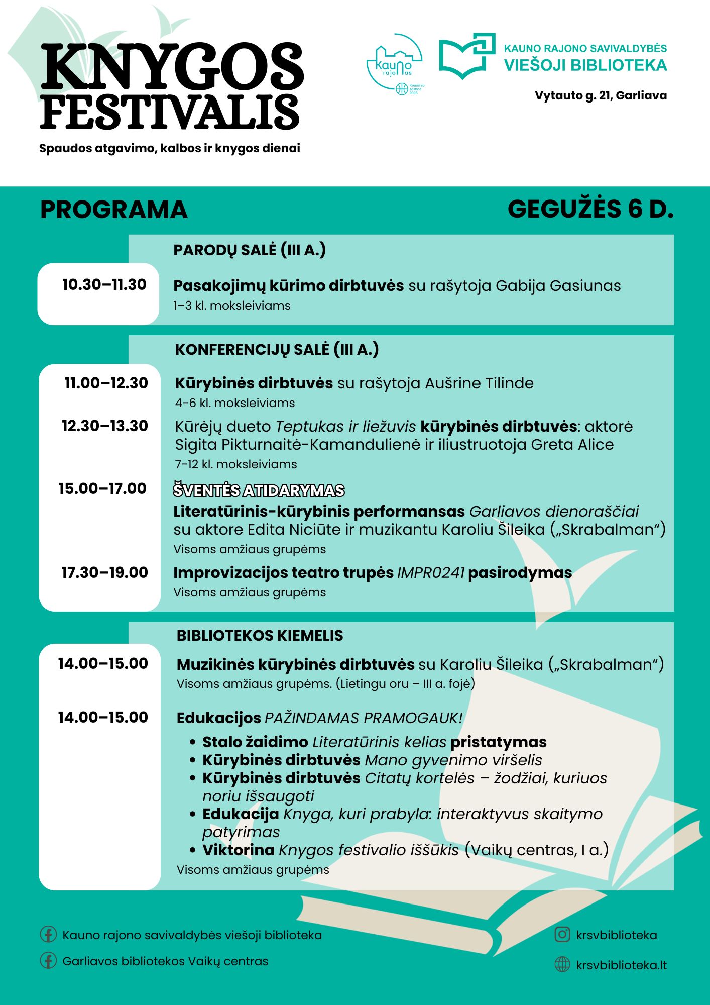 Šių metų renginio programos ašis – bendruomeniškumo skatinimas per knygos kultūrą. Jis sodriai atsiskleis literatūriniame-kūrybiniame performanse „Garliavos dienoraščiai“ (15 val.), kuriame aktorė Edita Niciūtė, Karolis Šileika (Skrabalman) ir garsinių skaitymų iššūkį priėmę bendruomenės nariai sujungs literatūros tekstus, muzikos garsus bei sceninę ekspresiją į unikalią patirtį. Kviečiame visus norinčius prisijungti prie performanso: galite skaityti savo kūrybą, mėgstamą Kauno rajono rašytojų kūrinį arba pasirinktą tekstą, pabrėžiantį Kauno rajono unikalumą per jo istoriją, kultūrą, paveldą ar kitus aspektus. (Registruokitės: [email protected])