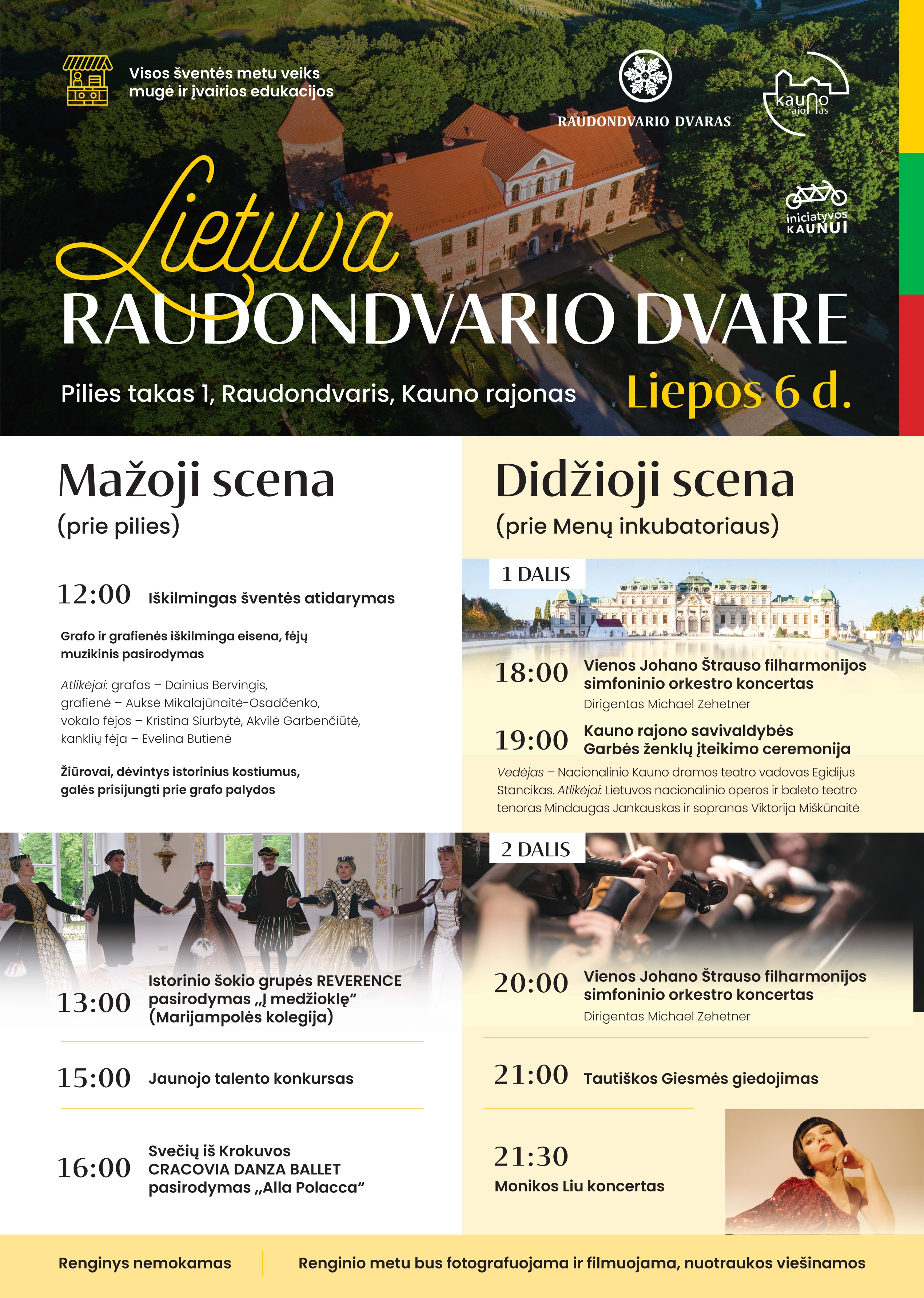 Valstybės dienos šventėje Raudondvario dvare skambės ir kitų atlikėjų bei žanrų muzika. Dienos bėgyje lauks šokio grupės iš Marijampolės „Reverence“, svečių iš Krokuvos (Lenkija) „Cracovia Danza Ballet“ pasirodymai, didžiojoje scenoje dainuos Lietuvos nacionalinio operos ir baleto teatro tenoras Mindaugas Jankauskas ir sopranas Viktorija Miškūnaitė. Vakare, 21.30 val., publiką linksmins charizmatiškoji Monika Liu.
