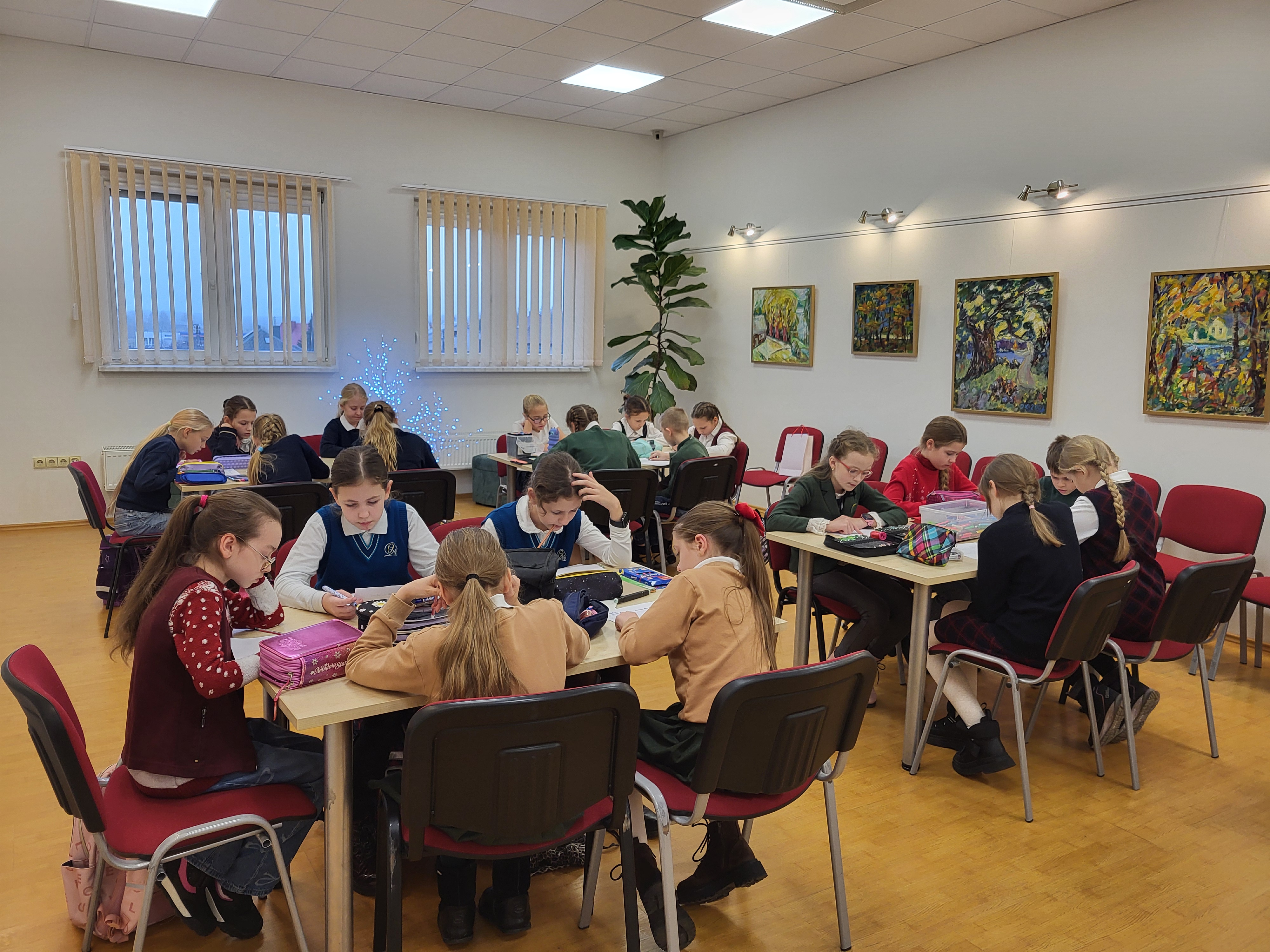 Kol mokiniai užsiėmė kūrybinėmis veiklomis, mokytojos irgi nenuobodžiavo: Kristinos Meilutės vedamose kūrybinėse dirbtuvėse „Tapyba smėliu“ įspūdingai sužibėjo kalėdiniai motyvai.