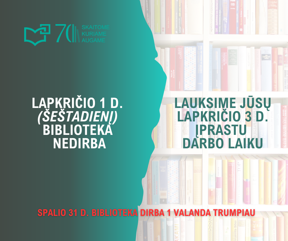 Spalio 31 d. (penktadienį) biblioteka dirba viena valanda trumpiau: