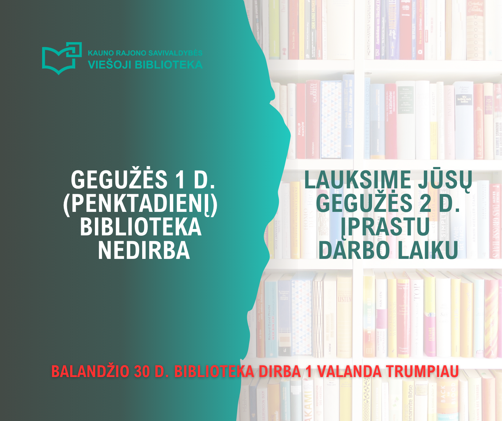 Balandžio 30 d. (ketvirtadienį) biblioteka dirba viena valanda trumpiau: