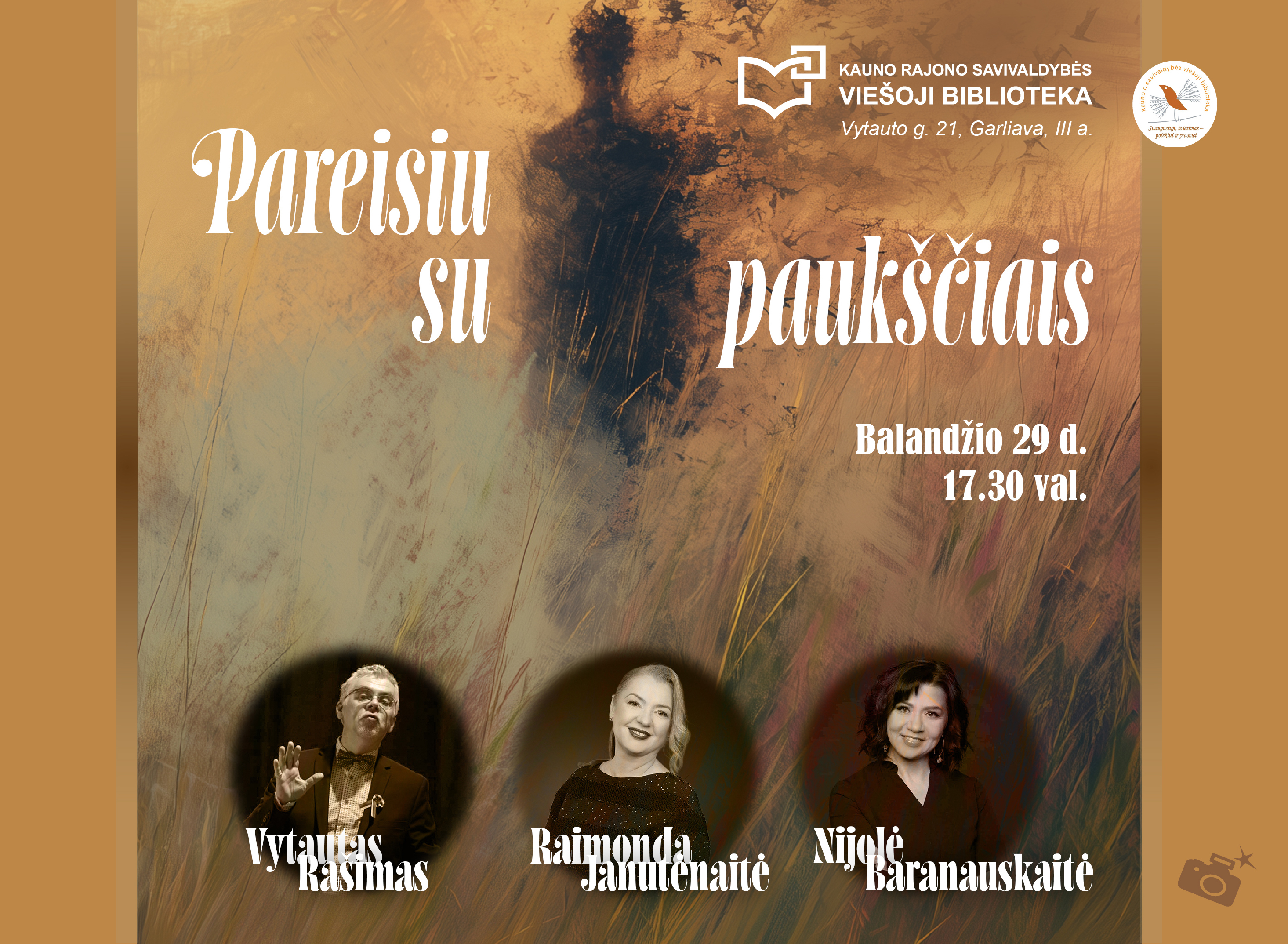 Maloniai kviečiame pasiklausyti atgimstančių vieno žymiausių lietuvių poeto žodžių! Marcelijaus Martinaičio 90-osioms gimimo metinėms skirto vakaro programą „Pareisiu su paukščiais“ atliks aktorius, gitaristas Vytautas Rašimas, mecosopranas Raimonda Janutėnaitė, pianistė Nijolė Baranauskaitė. Išgirsite gerai žinomų dainų pagal poeto tekstus; aktoriaus skaitomi eilėraščiai suteiks žodžiams naujos gyvybės pulsavimą. Bus dalijamasi prisiminimais apie poetą – kaip dėstytoją, mokslininką, draugą. Marcelijus Martinaitis (1936–2013) – vienas iškiliausių lietuvių poezijos balsų. Jo eilėraščiai – tai ne tik grožinė literatūra, bet ir tautos savivokos kronika, parašyta tuo metu, kai tiesiai kalbėti buvo pavojinga.