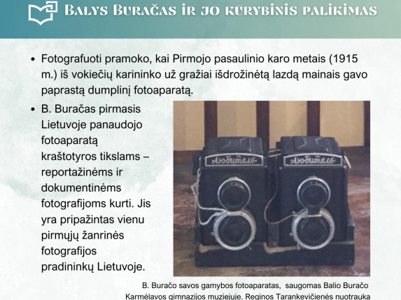 Ar žinojote, kaip B. Buračas gavo savo pirmąjį fotoaparatą? 1915 m. jis pasiūlė gražiai drožinėtą lazdą vokiečių karininkui mainais į dumplinį fotoaparatą. Ir mainai pavyko! Nuo tos dienos prasidėjo neįtikėtina kelionė per Lietuvą, kurios metu jis: