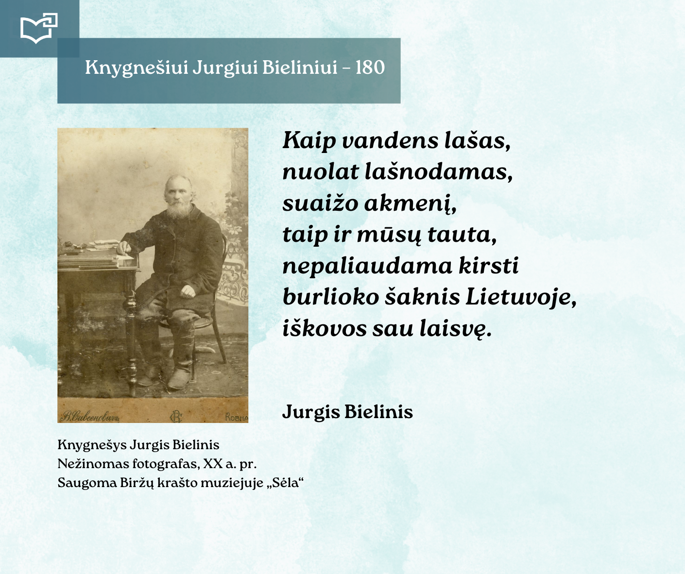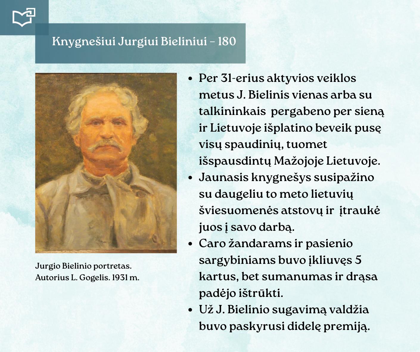 Kovo 16-osios – Knygnešio dienos – ir 180-ųjų Jurgio Bielinio gimimo metinių proga kviečiame Jus susipažinti su nauja virtualia paroda, skirta vienam ryškiausių lietuviško žodžio gynėjų. Kauno rajono savivaldybės viešosios bibliotekos vyr. bibliotekininkė Virginija Tamašauskienė parengė išsamią ekspoziciją, atskleidžiančią J. Bielinio nuopelnus knygnešystei, jo indėlį į tautinio sąmoningumo žadinimą ir kovą už lietuvišką žodį spaudos draudimo metais. Jurgis Bielinis – tai ne tik knygnešys, bet ir švietėjas, organizatorius, drąsuolis, kuriam lietuviškų knygų platinimas tapo gyvenimo misija. Jo veikla įkvėpė šimtus ir padėjo išsaugoti lietuvybę tamsiausiomis tautos istorijos valandomis.