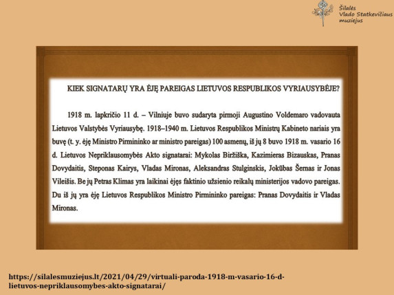 Virtuali paroda - „1918 m. vasario 16 d. Lietuvos nepriklausomybės akto signatarai“.